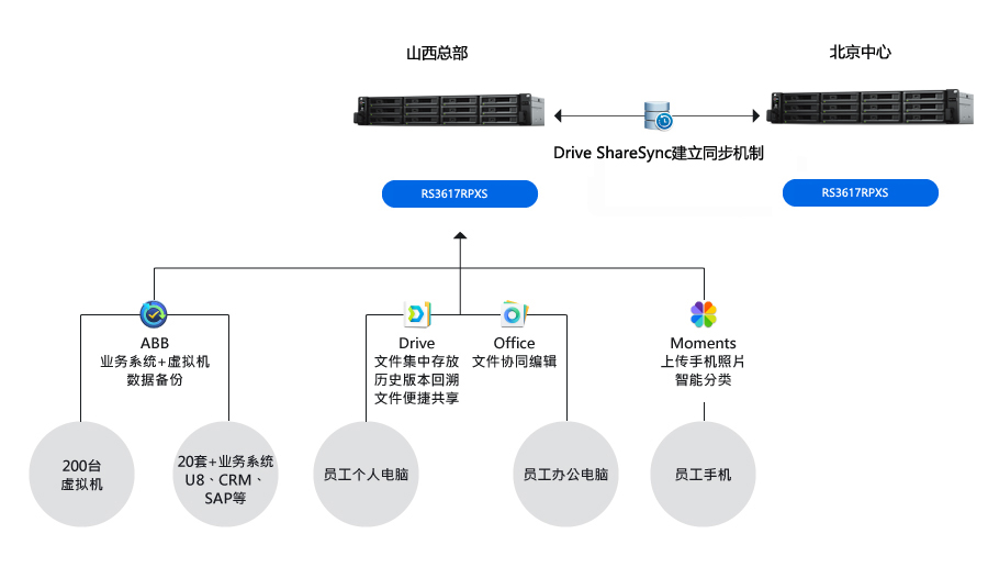 一份備份數(shù)據(jù)對(duì)公司的安全需求來(lái)說(shuō)還不夠,借用群暉又進(jìn)一步打造了異地備份容災(zāi)方案。振東制藥山西總部的 RS3617RPXS 的備份數(shù)據(jù),通過(guò)群暉 Drive ShareSync多分點(diǎn)同步功能復(fù)制到北京分公司的 RS3617RPXS 中。支持排程備份計(jì)劃。