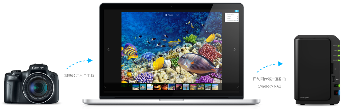 對于專業(yè)攝影師而言,一個(gè)容易上手的備份方案至關(guān)重要。有了 Cloud Station,將照片同步到 Synology NAS 變得十分簡單。在匯入相機(jī)的照片后,你只需將文件丟進(jìn)電腦里指定的文件夾,它們就會自動上傳到 Synology NAS。