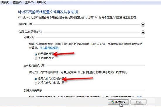 選擇 公共網(wǎng)絡(luò)---選擇以下選項(xiàng):啟動(dòng)網(wǎng)絡(luò)發(fā)現(xiàn)------啟動(dòng)文件和打印機(jī)共享-----啟用共享以便可以訪問網(wǎng)絡(luò)的用戶可以讀取和寫入公用文件夾中的文件(可以不選)----關(guān)閉密碼保護(hù)共享( 注釋:其他選項(xiàng)默認(rèn)即可!)